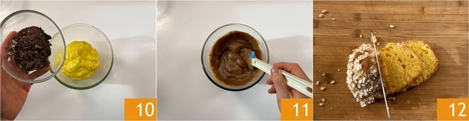 Na outra, adicione o chocolate ralado 10 e misture até que esteja completamente derretido 11, depois deixe esfriar. Neste ponto, corte a colomba em fatias de 1 cm de espessura 12.