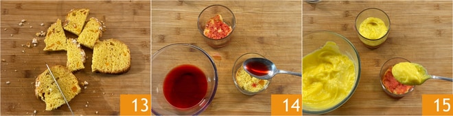 Depois, corte as fatias em pedaços 13. Pegue 4 tigelinhas com capacidade de 200 ml e forre o fundo com os pedaços de colomba, achatando-os levemente com as mãos. Molhe a colomba com o alchermes 14 e cubra com uma camada de creme de confeiteiro clássico 15.