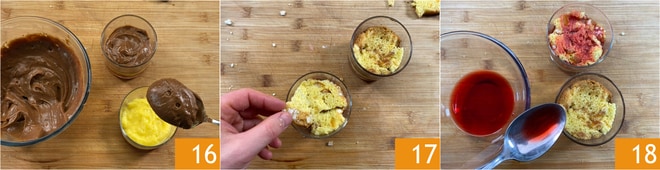 Adicione uma camada de creme de chocolate 16 e outra de colomba 17, depois molhe novamente com o alchermes 18.