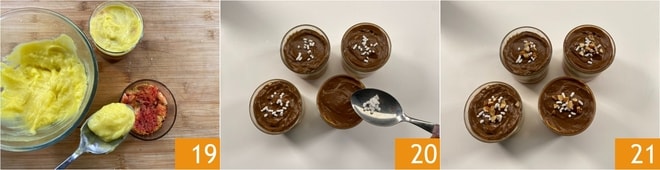 Finalize com uma camada de creme de confeiteiro clássico 19 e uma camada de creme de chocolate. Decore com confeitos 20 e pedaços de amêndoas. Coloque na geladeira até o momento de servir a sua zuppa inglese de colomba 21!