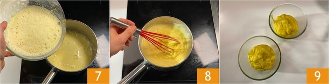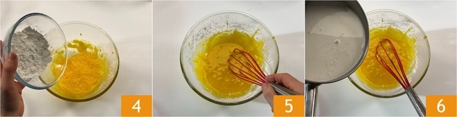Agora adicione também o amido de milho 4 e misture novamente 5. Assim que o leite estiver fervendo, adicione-o lentamente à mistura de ovos, mexendo para diluir 6.