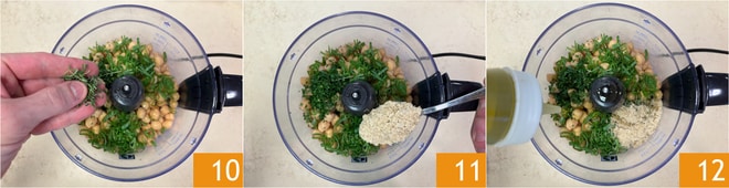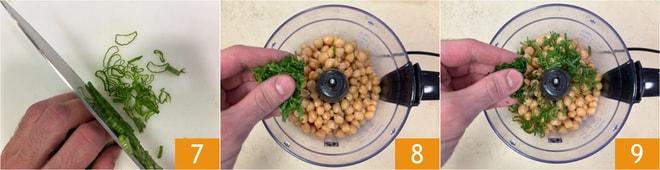 Enquanto isso, corte finamente a cebolinha 7 e coloque-a em um mixer 8 junto com o grão-de-bico e a salsinha picada 9.
