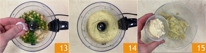 Ajuste o sal 13 e a pimenta, em seguida, bata até obter uma mistura homogênea 14. Transfira tudo para uma tigela e adicione a farinha de grão-de-bico 15.