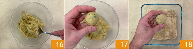 Misture até obter uma massa moldável 16. Forme as almôndegas 17 e passe-as na farinha de rosca 18.