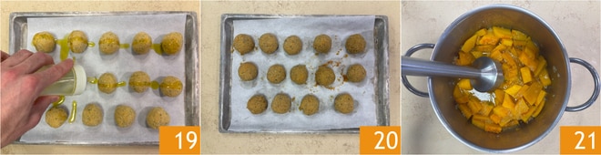 Coloque as almôndegas em uma assadeira coberta com papel manteiga e regue com um fio de óleo 19. Asse em forno ventilado pré-aquecido a 200°C por cerca de 25 minutos, virando-as na metade do tempo 20. Retire as ervas aromáticas e bata com um mixer de imersão 21 até obter um creme liso e homogêneo.