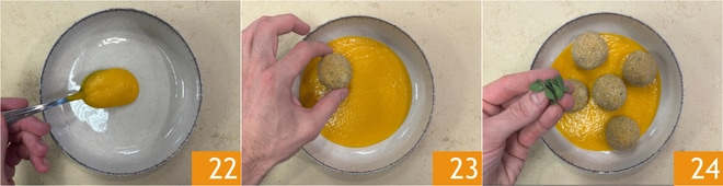 Você está pronto para empratar: espalhe o creme de abóbora no fundo do prato 22, depois disponha as almôndegas 23 e algumas folhas de manjerona 24.