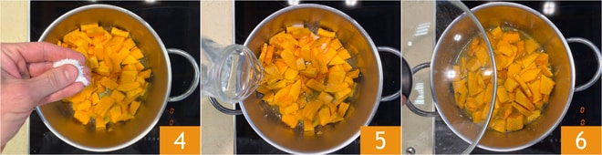 Ajuste o sal 4 e a pimenta, depois aromatize com tomilho e louro. Cubra com caldo de legumes 5, tampe 6 e cozinhe em fogo médio por cerca de 20 minutos, até que a abóbora esteja macia.