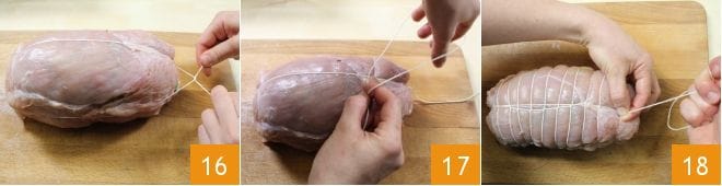 Agora pegue o barbante de cozinha e amarre o assado que você formou: passe o barbante primeiro por baixo e depois por cima da carne, no sentido do comprimento, amarrando bem as pontas do fio nas extremidades e deixando uma parte do barbante um pouco mais longa 16. Use o barbante mais longo e continue voltando pelo lado oposto e, em seguida, faça um nó na extremidade para criar a base para sua amarração. Para formar a gaiola, pegue o barbante, crie uma laçada segurando a base dela com os dedos 17 e insira a mão na laçada, girando a corda algumas vezes, depois passe a carne na laçada obtida. Prenda bem a base do laço apertando o anel criado ao redor da carne e puxando levemente o barbante para cima para apertar o nó, e repita essa operação ao longo de toda a carne 18. Para realizar essa operação da melhor forma, consulte nossa Escola de Culinária: Como amarrar o assado.