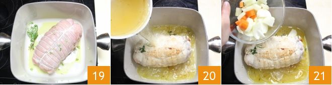 Depois disso, pegue uma panela grande, adicione um fio de azeite juntamente com um maço de tomilho e alecrim e acrescente o assado amarrado 19. Deixe-o dourar de ambos os lados, depois regue com o caldo de legumes 20 e adicione também os vegetais para o fundo que você separou 21. Para descobrir como preparar e conservar o caldo de legumes, leia nossa Escola de Culinária: Caldo de legumes.