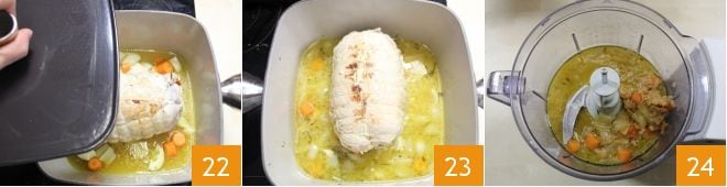 Cubra a panela com uma tampa 22 e deixe cozinhar por 1 hora e 30 minutos, virando o assado de vez em quando, até que os vegetais do fundo estejam cozidos e amolecidos e o assado esteja firme e bem dourado 23. Quando o assado estiver cozido, transfira-o para um prato para esfriar, despeje os vegetais juntamente com o fundo de cozimento em um mixer 24.