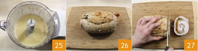 Bata até obter uma mistura homogênea 25 e, se o molho ainda estiver líquido, transfira-o para uma panela e cozinhe em fogo baixo, para que engrosse. Agora coloque o assado resfriado em uma tábua 26 e corte-o em fatias de cerca de 1/2 centímetro de espessura 27. Agora é só servir o assado frio de peru tanto quente quanto frio com o molhinho de acompanhamento!