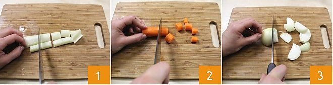 Para preparar o assado frio de peru, comece lavando e cortando os vegetais para o fundo. Descasque o aipo e corte-o grosseiramente 1, lave as cenouras, descasque-as e corte-as em rodelas de cerca de 2 cm de espessura 2. Por fim, descasque e fatie a cebola 3 e reserve tudo.