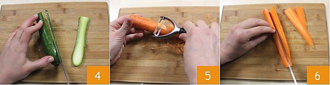 Agora cuide dos vegetais para o recheio: lave as abobrinhas cuidadosamente, seque-as e corte-as em fatias de meio centímetro de espessura no sentido do comprimento 4. Agora lave e descasque as cenouras, descasque-as com um descascador 5 e corte-as longitudinalmente em fatias de meio centímetro de espessura 6.