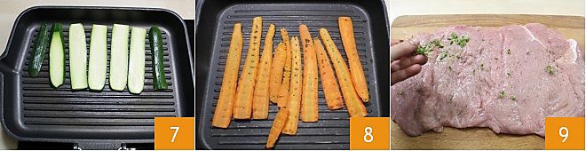 Em seguida, aqueça uma grelha e, uma vez quente, grelhe as fatias finas de abobrinha 7 e cenoura 8 de ambos os lados até que fiquem levemente tostadas, mas macias. Depois disso, passe para a composição do assado: coloque a fatia de peru sobre uma tábua de corte e tempere com sal, pimenta a gosto e folhas de tomilho 9.