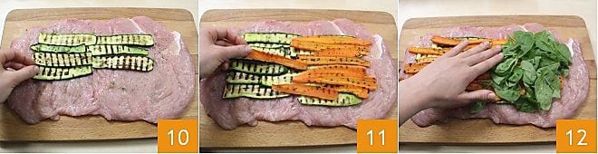 Em seguida, forme uma camada com as fatias de abobrinha grelhada 10, continue com as fatias de cenoura grelhada 11 e as folhas de espinafre fresco que você lavou previamente sob água corrente 12.