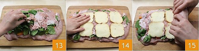 Adicione também as fatias de presunto cozido 13 e, após cortar o provolone defumado em fatias finas, disponha-as sobre as outras camadas 14. Em seguida, comece a enrolar delicadamente a fatia de peru, pressionando bem com as mãos para garantir que o recheio não saia 15.