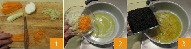 Para preparar o arroz venere ao curry, prepare um litro de Caldo de legumes, depois lave, descasque e pique o aipo, a cenoura e a cebola para o refogado 1. Aqueça o azeite em uma panela larga, adicione o refogado 2, deixe murchar por 5 minutos e depois acrescente o arroz venere 3.
