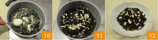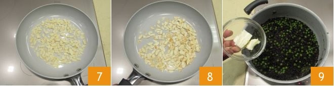 Enquanto isso, coloque as amêndoas em uma frigideira 7 e toste-as por poucos minutos 8. No final do cozimento, desligue o fogo e misture o arroz com a manteiga 9,