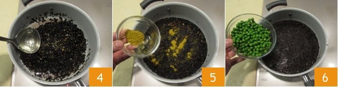 Deixe tostar o arroz por alguns instantes e depois adicione o caldo de legumes quente, uma concha de cada vez 4, esperando que o líquido seja absorvido antes de adicionar mais. Cozinhe por 10 minutos, em seguida, adicione o curry 5, regue imediatamente com o caldo e misture para temperar o arroz, depois adicione as ervilhas 6 e cozinhe por mais 10-15 minutos, adicionando sempre o caldo aos poucos até que o arroz esteja cozido. Ajuste o sal e a pimenta a gosto, se necessário.