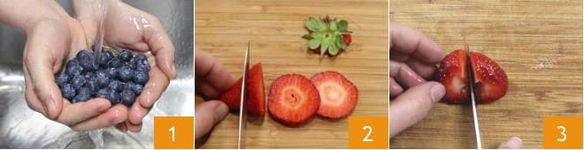 Para preparar o aspic de frutas vermelhas, comece lavando e secando os mirtilos 1, os morangos, as amoras, as framboesas e as groselhas brancas. Remova o talo dos morangos e corte alguns em rodelas 2 e os outros pela metade 3.