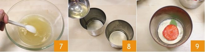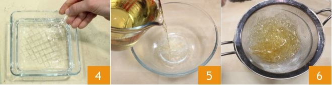 Em uma tigela separada, coloque as folhas de gelatina em água fria por 10 minutos 4 ou até amolecerem. Enquanto isso, aqueça 50 ml de moscatel e depois despeje em uma tigela 5. Escorra bem as folhas de gelatina com uma peneira 6 e esprema-as.