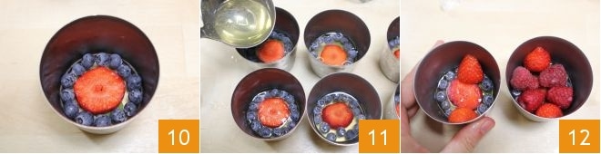preencha todo o contorno com os mirtilos 10. Cubra com o moscatel (cerca de 15 g) 11 e coloque novamente na geladeira para endurecer por mais 15 minutos. Depois, continue acomodando os pedaços de morango na vertical com a parte cortada voltada para o perímetro da forma e 4 framboesas com a parte mais larga voltada para fora 12: coloque um mirtilo no centro e cubra com líquido, então coloque novamente na geladeira por 15 minutos.