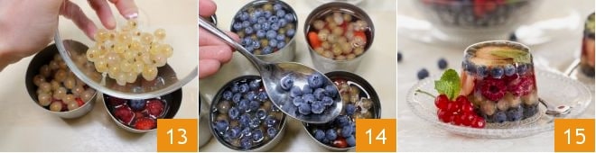 Quando a gelatina estiver solidificada, disponha uma camada de groselhas brancas 13, depois cubra novamente com a solução à base de moscatel e coloque as forminhas na geladeira por mais 15 minutos. Termine com uma última camada de mirtilos 14 e deixe os aspics repousarem na geladeira por pelo menos 3 horas antes de servi-los. Na hora de desenformá-los, mergulhe por alguns segundos em uma tigela com água fervente e, em seguida, ajude a desenformá-los cortando o contorno com a ponta de uma faquinha e vire-os em um prato. Decore seus aspics de frutas vermelhas com folhinhas de hortelã e algumas frutas vermelhas restantes 15 e sirva!