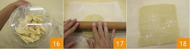 Misture tudo, cubra com o filme plástico 16 e coloque na geladeira até o momento de usar. Pegue o bloco que foi deixado na geladeira para endurecer, se estiver muito duro, trabalhe-o por alguns instantes com as mãos. Depois estenda-o adicionando um pouco de farinha 17 até obter um quadrado de cerca de 22 cm com uma espessura de 0,5-0,7 mm 18.