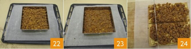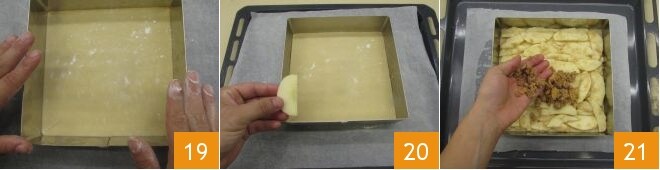 Em seguida, deslize o papel manteiga sobre uma assadeira e, usando um quadrado de confeitaria com cerca de 21,5 cm, corte as bordas da massa 19. Neste ponto, disponha as maçãs de maneira ordenada sobre a base 20 e cubra tudo esfarelando o streusel com as mãos 21