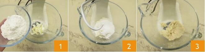 Para preparar as barras de torta de maçã, a primeira coisa a fazer é começar a preparar a massa tipo "crust". Na tigela de uma batedeira, equipada com gancho, junte a manteiga fria cortada em cubos com a farinha 1 e o açúcar 2. Trabalhe a mistura até obter uma consistência homogênea 3;