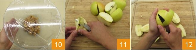 cubra com o filme plástico 10 e transfira a mistura para a geladeira até o momento de usar 10. Neste ponto, cuide das maçãs, divida-as em 4 e remova primeiro a parte central com as sementes 11. Retire a casca 12