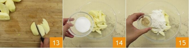 e corte os gomos em fatias 13. Transfira-os para uma tigela, adicione o açúcar 14, a farinha e o gengibre em pó 15.