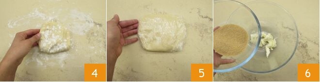 transfira-a para uma superfície levemente enfarinhada e trabalhe-a por mais alguns instantes 4, depois envolva-a em filme plástico 5 e deixe descansar na geladeira por pelo menos 25-30 minutos. Enquanto isso, cuide do streusel: coloque em outra tigela a manteiga junto com o açúcar mascavo 6.