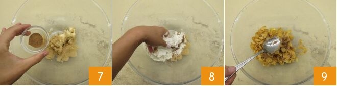 Adicione a noz-moscada, a canela 7 e a farinha. Amasse com as mãos 8 e somente quando estiver tudo bem misturado, adicione os flocos de milho 9, misture com uma colher,