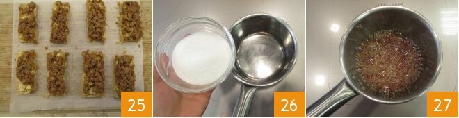 de modo a obter 8 barras 25. Neste ponto, prepare o caramelo: despeje a água em uma panela, adicione o açúcar 26 e misture bem os dois ingredientes, depois acenda o fogo e deixe ferver em fogo médio sem mais mexer. Quando a mistura atingir uma cor âmbar não muito escura 27, retire a panela do fogo