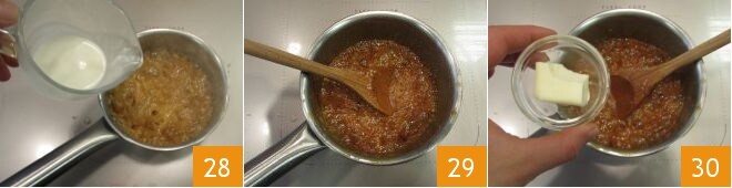 e adicione o creme de leite fresco líquido aos poucos 28, mexendo ao mesmo tempo com uma colher de pau 29; certifique-se de adicionar o creme de leite em temperatura ambiente e gradualmente, tomando cuidado com o vapor e as bolhas que se formarão. Por último, adicione o pedaço de manteiga 30