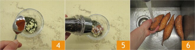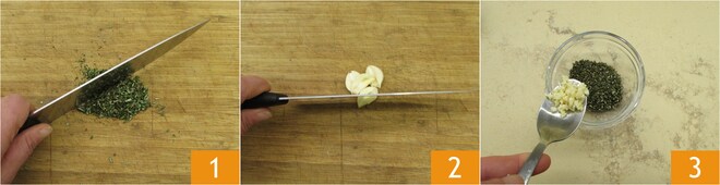 Para preparar as batatas-doces assadas, primeiro pique finamente o alecrim 1 e o alho 2. Coloque-os em uma tigelinha 3