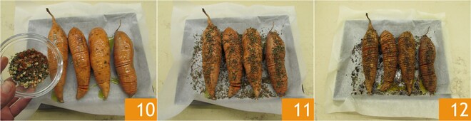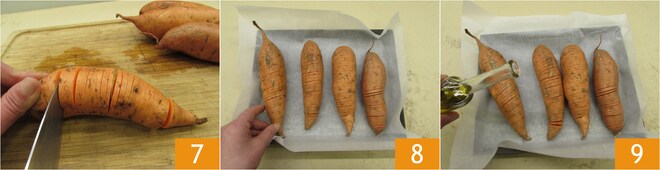 e, por fim, distribua bem a mistura de aromas sobre as batatas 10 11. Asse no forno ventilado por 50-55 minutos. Após o tempo de cozimento, sirva suas batatas-doces assadas 12.