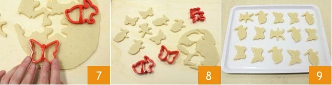 depois, com a ajuda de moldes em forma de animais (como borboletas, ursinhos e coelhinhos) corte os biscoitinhos (7-8) e coloque-os em uma bandeja 9, coloque os biscoitos na geladeira por pelo menos 15 minutos para que mantenham a forma durante a cocção.
