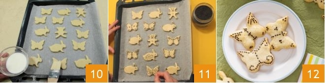 Em seguida, transfira os biscoitinhos para uma assadeira forrada com papel manteiga e decore as formas com sementes de papoula: pincele a superfície com leite 10 e aplique as sementes de papoula com um palito para definir os detalhes dos animais: olhos, boca, orelhas ou apenas o contorno da forma 11. Asse os biscoitinhos em forno estático pré-aquecido a 180° por 10 minutos (se for forno ventilado a 160° por 5-6 minutos) depois, quando estiverem prontos, retire os biscoitos do forno e deixe esfriar em uma grade antes de saboreá-los 12!