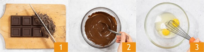 Para preparar os biscoitos de chocolate sem manteiga, pique o chocolate amargo com uma faca 1. Derreta o chocolate em banho-maria, mexendo frequentemente 2. Com um batedor de mão, bata os ovos com o açúcar 3.
