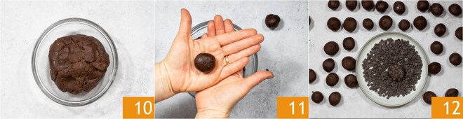 A massa ficará macia 10, mas deixe descansar na geladeira por 1 hora, coberta com filme plástico para endurecer. Após o tempo de descanso, a massa estará firme e trabalhável, pegue pedaços do tamanho de nozes e modele rolando entre as mãos 11. Forme biscoitos que pesem entre 25 e 30 g. Coloque 80 g de gotas de chocolate em um prato e pressione suavemente cada bolinha nas gotas de chocolate, para que adiram à massa de um lado 12.