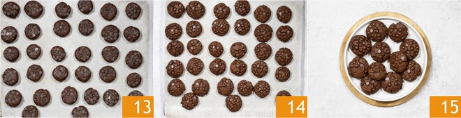 Cubra uma assadeira com papel manteiga e coloque os biscoitos 13. Asse os biscoitos em forno estático pré-aquecido a 170° por 15-20 minutos, retire do forno 14 e deixe esfriar. Os biscoitos de chocolate sem manteiga recém-assados são macios, mas quando frios serão quebradiços e crocantes 15.