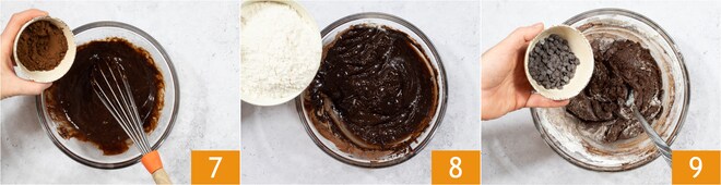 Incorpore também o cacau 7, misture e adicione o extrato de baunilha, a farinha e o fermento 8. Finalize com 30 g de gotas de chocolate 9 e amasse rapidamente primeiro com a colher e depois com as mãos.