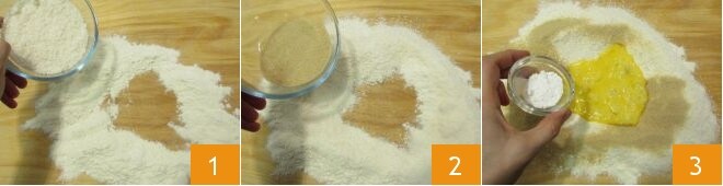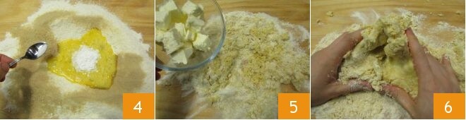 e o sal 4. Comece a misturar os ingredientes com as mãos e então adicione a manteiga fria em cubos 5. Amasse rapidamente para não aquecer demais a massa 6,