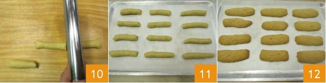 depois divida-os em charutos com 8 cm de comprimento e cerca de 15 g cada 10: com essas quantidades, você deve obter cerca de 42 biscoitos. Transfira os charutos para uma assadeira forrada com papel manteiga 11 e asse os biscoitos em forno estático pré-aquecido por 15 minutos a 190°C. Quando estiverem assados, retire os biscoitos do forno 12 e deixe-os esfriar um pouco.