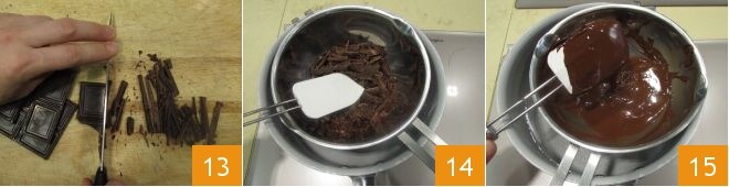 Enquanto isso, pique o chocolate amargo com uma faca 13 e derreta-o no micro-ondas ou em banho-maria (14-15).