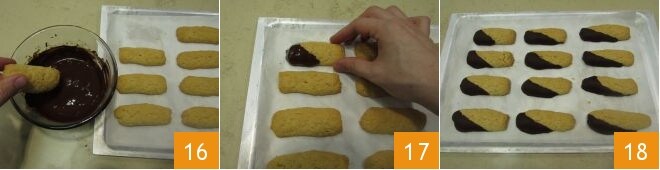 Molhe uma ponta dos biscoitos no chocolate derretido 16 e coloque-os novamente na assadeira forrada com papel manteiga 17, coloque a bandeja na geladeira por 30 minutos para o chocolate secar. Seus biscoitos de coco e chocolate estão prontos para serem saboreados! 18.