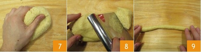 até obter uma massa homogênea e macia 7. Agora pré-aqueça o forno a 190°C em modo estático. Pegue porções de massa com uma espátula 8, estique-as para criar rolinhos com cerca de 2 cm de diâmetro 9,
