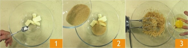 Para preparar os biscoitos de colher, primeiro certifique-se de que os ingredientes estão em temperatura ambiente. Em uma tigela, combine a manteiga amolecida com o sal 1 e o açúcar mascavo 2 e bata por alguns minutos com a batedeira, depois adicione o ovo 3 e misture por mais um minuto.